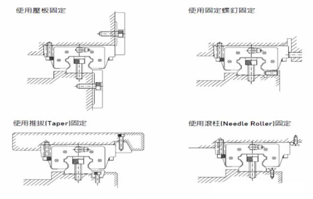 當(dāng)機(jī)床受到振動(dòng)和沖擊力的影響時(shí),滑軌和滑塊很可能偏離原來的固定位置,影響精度。為了避免類似的情況,建議采用下圖所列的四種固定方式來固定滑軌和滑塊,以保證機(jī)器的操作精度。