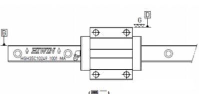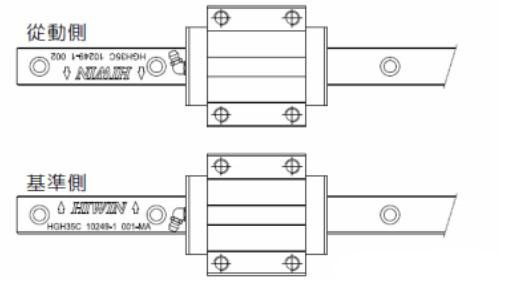 2確認(rèn)安裝基準(zhǔn)面:滑軌基準(zhǔn)面為“HIWIN”旁箭頭所示的側(cè)面(b);滑塊基準(zhǔn)面為拋光光滑面(d)。