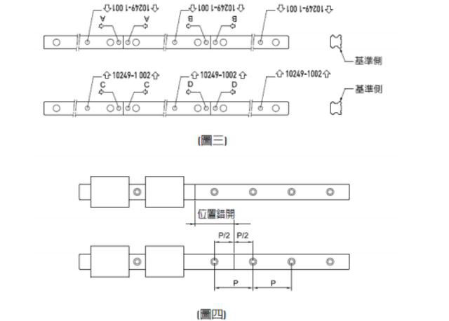 三?;壗宇^:滑軌接頭必須按滑軌上指示的順序安裝,以保證直線滑軌的精度。接頭標(biāo)記位于接頭端的上表面。請(qǐng)將同一接頭標(biāo)記的兩端連接在一起。(如圖3所示)建議配合鋼軌接頭齒的位置應(yīng)錯(cuò)開,以避免因不同鋼軌的不同而造成進(jìn)度差。(如圖4所示)。